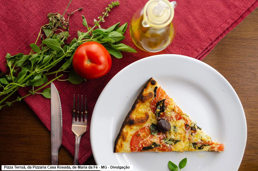 Ainda em Minas Gerais, na pacata e acolhedora cidade de Maria da Fé, a Pizzaria Casa Rosada preparou uma receita que vai agradar aos amantes de uma das iguarias mais consumidas no Brasil. A Pizza Terruá, criação do Chef Artur Miguel, é produzida com massa fina, molho, muçarela, tomate, manjericão, alho frito, alho em conserva de azeite, azeitonas pretas e parmesão ralado.
