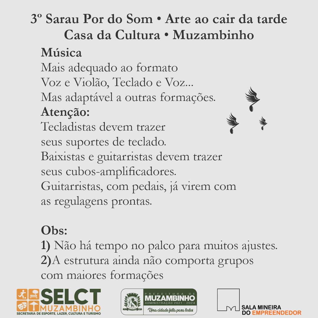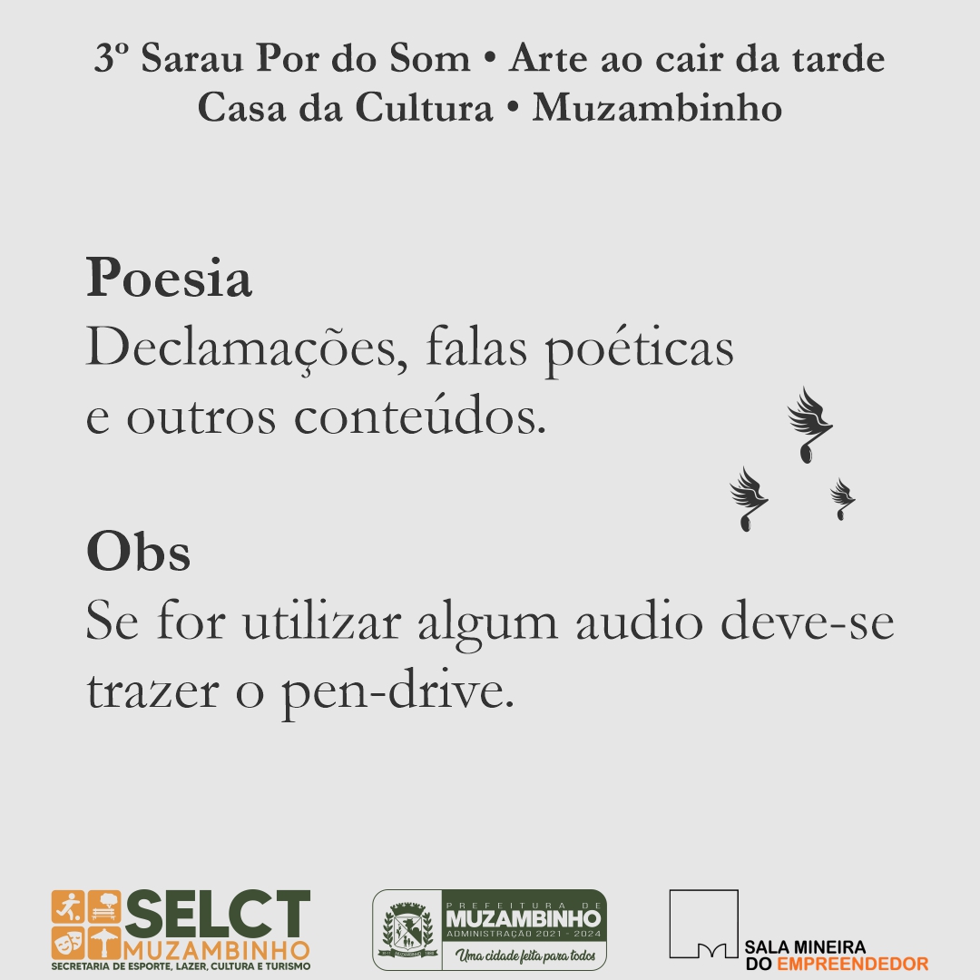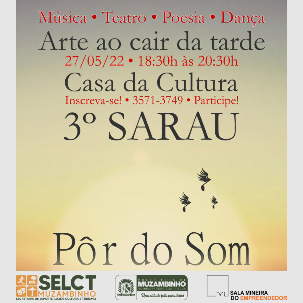 As inscrições para as apresentações no sarau poderão ser feitas na Casa da Cultura (Rua Tiradentes no 264 – Centro) ou por telefone/WhatsApp – 35 3571-3749.