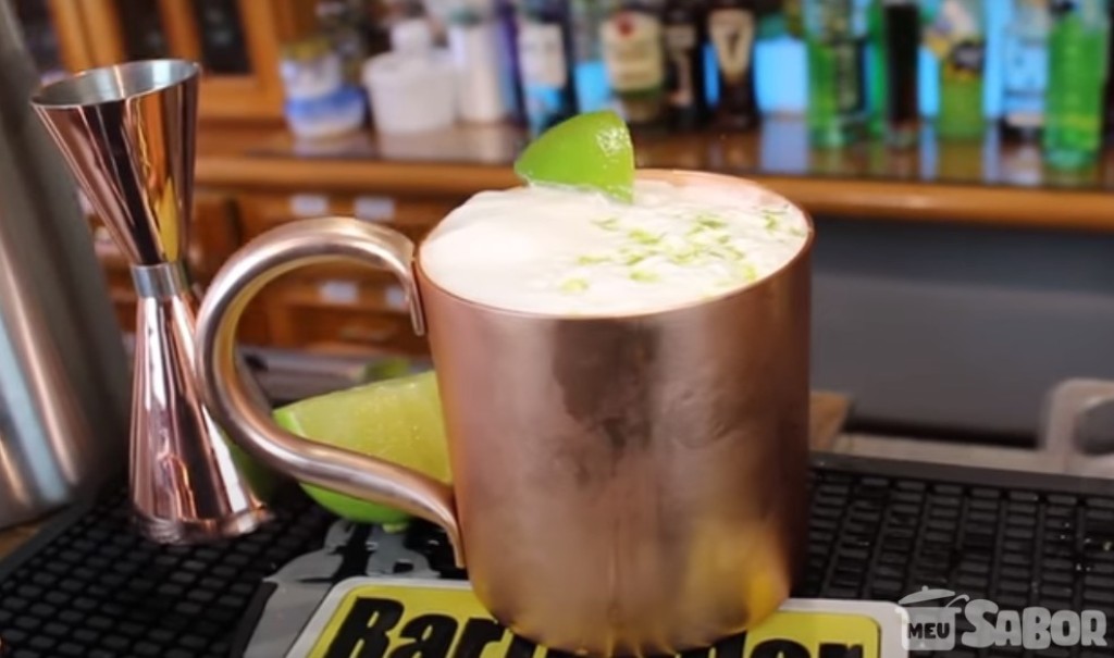 - Em uma caneca, adicione o gelo até quase completar a caneca, logo em seguida a vodca, o suco de limão Taiti, xarope de gengibre, complete com água com gás, coloque devagar para não perder o gás da água.