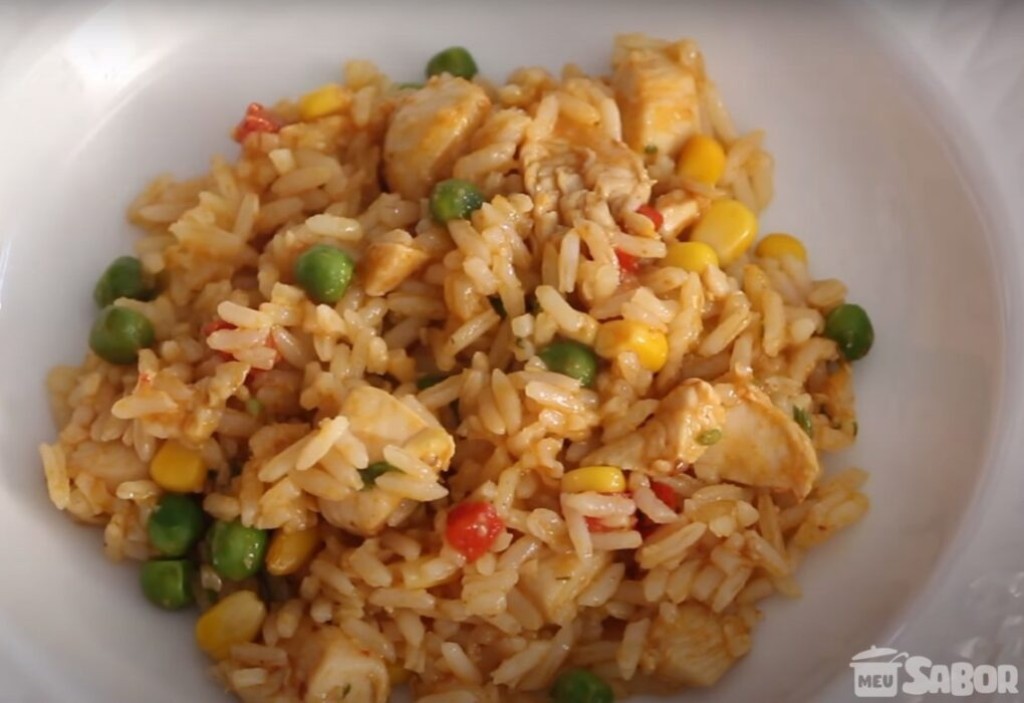 - Acrescente a cebola picada e mexa ate amolecer, adicione o alho, o pimentão, milho e a ervilha, mexa, logo adicione o molho de tomate e o caldo de galinha dissolvido.