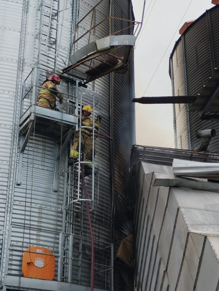 Após a extinção das chamas, foi realizado rescaldo técnico criterioso. Em ocorrências envolvendo silos, o calor pode permanecer retido no interior da massa de grãos, exigindo escoamento controlado e monitoramento constante para evitar nova ignição.