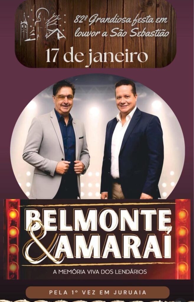 A cidade de Juruaia vive clima de fé, tradição e celebração com a realização da 82ª Grandiosa Festa em Louvor a São Sebastião, padroeiro do município. Um dos destaques da programação deste ano é o show da dupla Belmonte & Amaraí, que se apresenta no dia 17 de janeiro, marcando a primeira vez dos artistas na cidade.