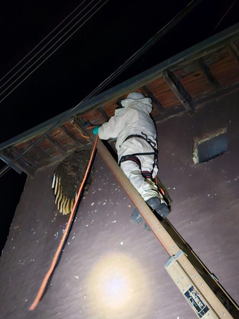 Para a remoção, os bombeiros utilizaram roupão de apicultor, escada, caixas para armazenamento dos insetos e EPI’s de trabalho em altura.