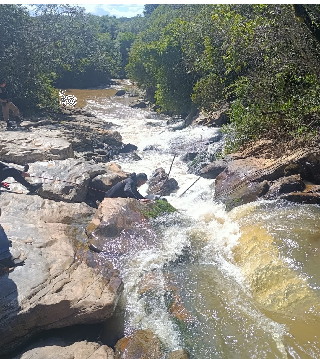 Chegando ao local, os militares foram informados por testemunhas de que a vítima (homem, 23 anos) já estava submersa há cerca de uma hora, encontrando-se presa às pedras em uma área de corredeira de difícil acesso.