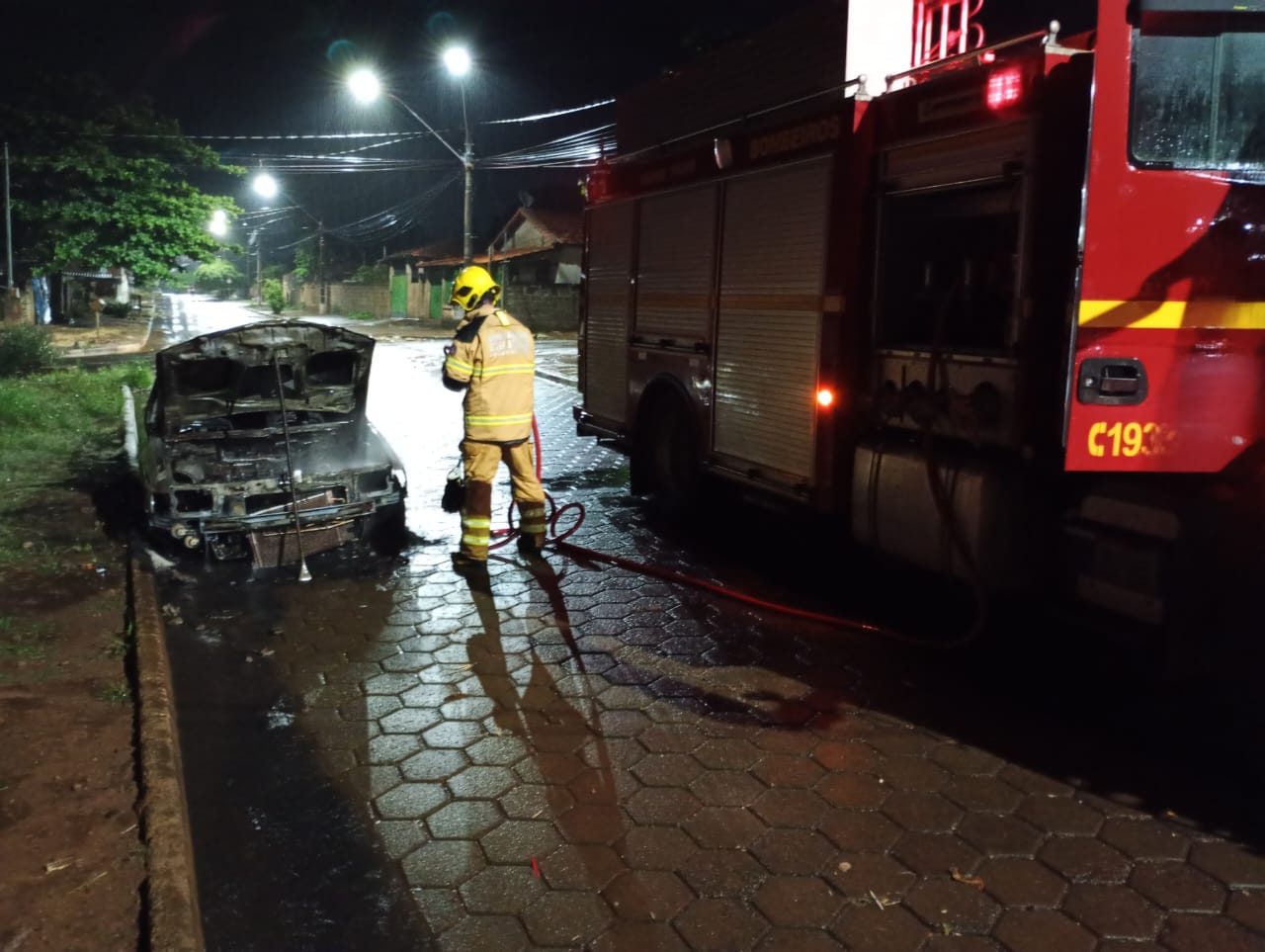 Quando os bombeiros chegaram havia poucas chamas no veículo, foi feita a extinção delas e o resfriamento do carro.