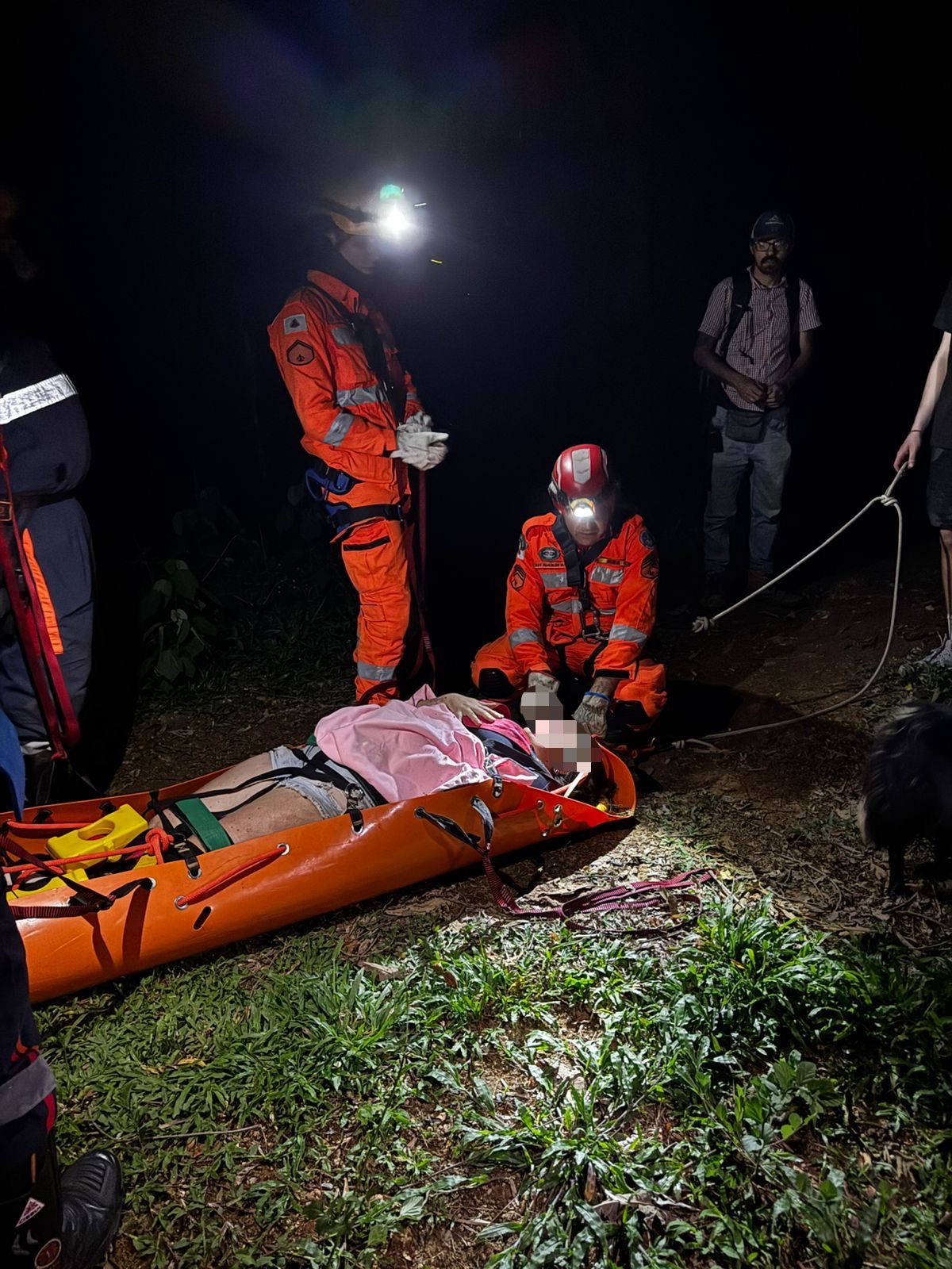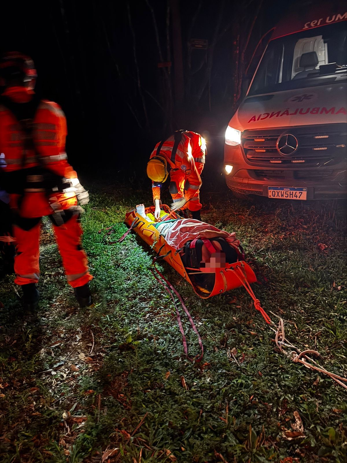 Segundo informações repassadas pela equipe da Unidade de Suporte Básico (USB), uma vítima do sexo feminino sofreu uma queda de aproximadamente 7 metros durante deslocamento pela trilha. No local, a vítima encontrava-se consciente e orientada, apresentando suspeita de fratura em membro inferior esquerdo, já imobilizada pela equipe do SAMU.