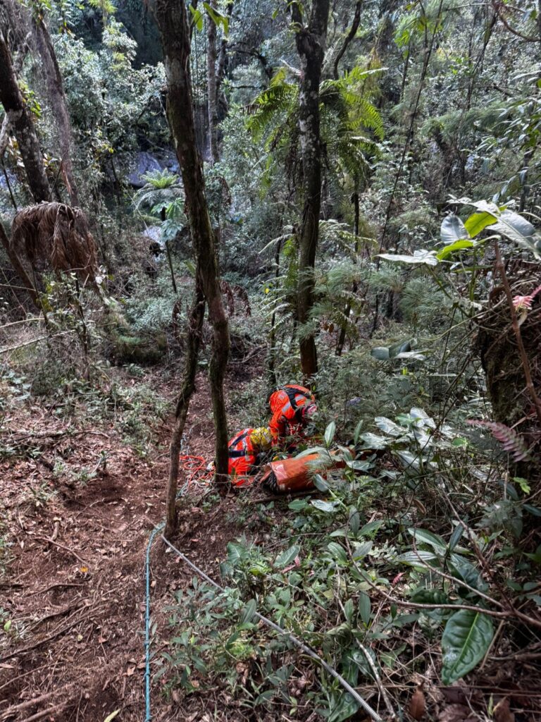 Devido às características do terreno e à dificuldade de acesso, a guarnição do CBMMG iniciou a remoção com técnicas de salvamento terrestre e salvamento em altura, posicionando primeiramente a vítima, com cautela, em maca tipo SKED. Em seguida, foi realizada a montagem de um sistema de redução de forças para içá-la e permitir a progressão segura no trecho mais crítico do acesso.