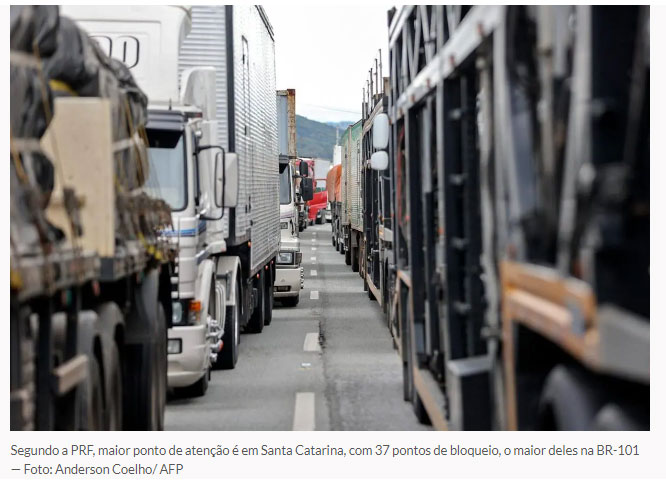 O Brasil tem 138 pontos de bloqueios ou interdições de tráfego em rodovias federais, segundo balanço divulgado no final da tarde da segunda-feira (31) pela Polícia Rodoviária Federal (PRF). O Estado com maior número de restrições é Santa Catarina, contabilizando 37 pontos bloqueados ou interditados, conforme a corporação.
