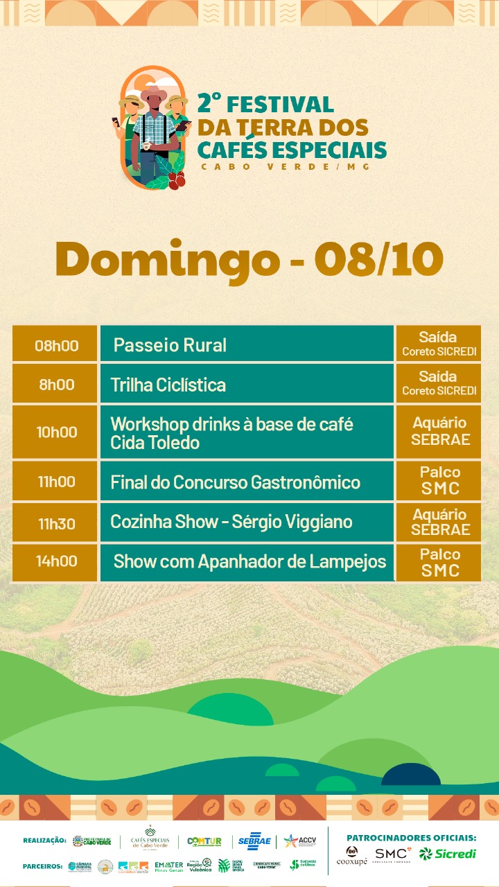 A programação conta com palestras voltadas para o setor do agronegócio, visitas em propriedades rurais, prova final do concurso dos cafés especiais e trilha ciclística. No encerramento (8/10), será realizada a Cozinha Show com o chef Sérgio Viggiano, diretor nacional de Comunicação e Marketing da FIC Brasile – Federação Italiana de Chefes que tem o propósito de trazer os fundamentos da tradicional culinária italiana para os mais jovens.