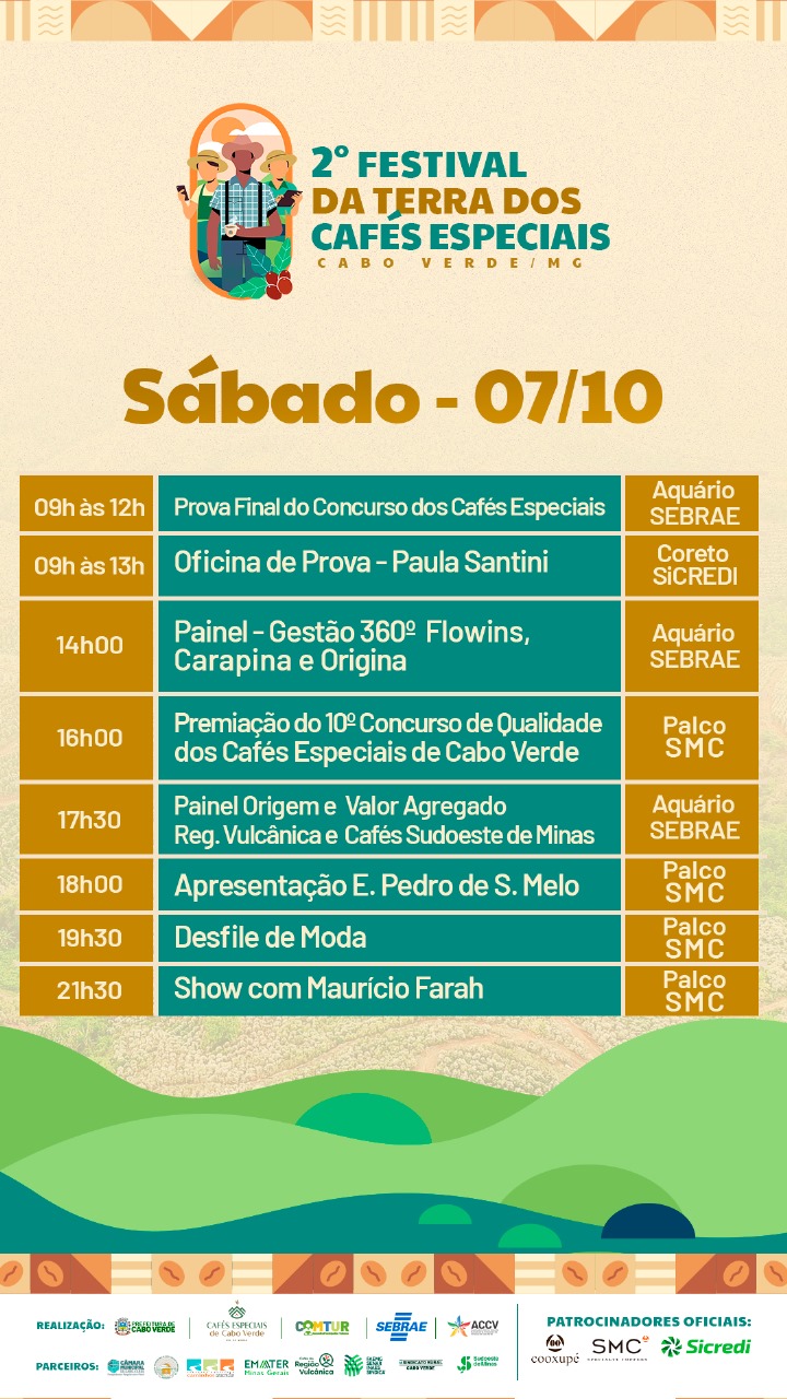 O 2° Festival da Terra dos Cafés Especiais é resultado de uma parceria entre Sebrae Minas, Prefeitura de Cabo Verde e Sala Mineira do Empreendedor, além da Associação de Produtores de Cafés Especiais de Cabo Verde e da Associação Comercial da cidade (ACCV).