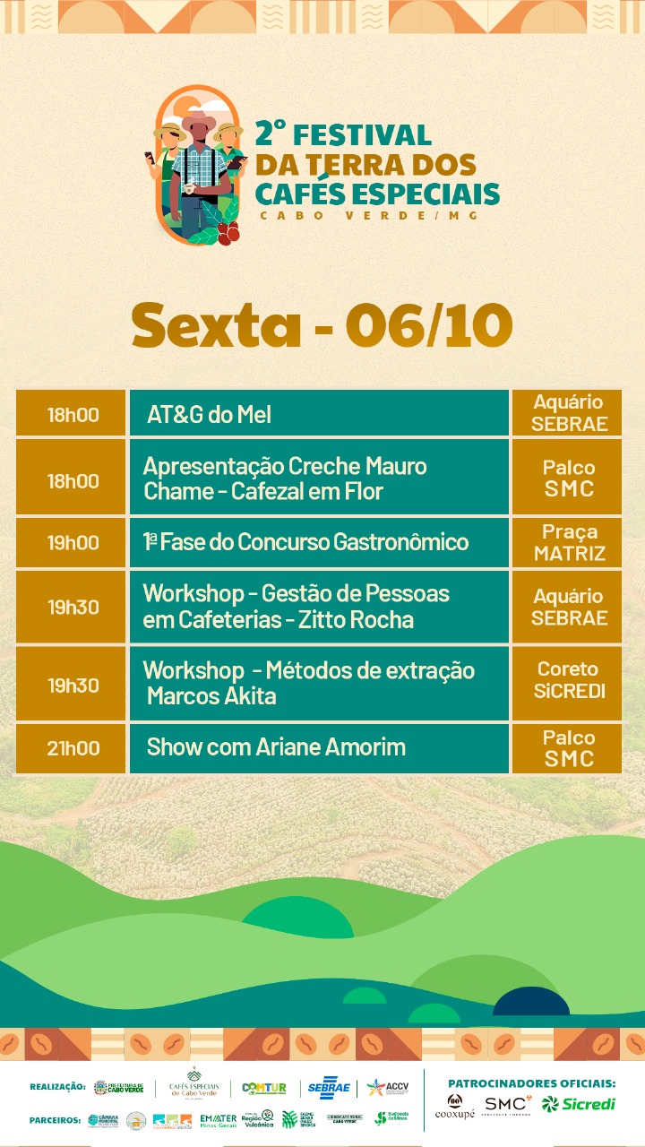 A principal vocação do município de Cabo Verde, na região Sudoeste do estado, ganha destaque neste fim de semana (6 a 8/10), com a realização do 2° Festival da Terra dos Cafés Especiais. Diversas atividades, gratuitas, serão promovidas na Praça da Matriz, e vão reunir cafeicultores, profissionais que atuam no setor e apreciadores da bebida – os coffee lovers, que estão ganhando a cada dia novos adeptos -, além de donos de cafeterias.