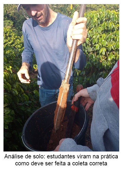 Na última visita, foram até a lavoura, viram de perto as plantas carregadas e aprenderam com o cafeicultor a importância da coleta de terra para a análise do solo. Muitos dos alunos são filhos de cafeicultores e mesmo eles não sabiam como era a forma correta de coletar a terra para análise.