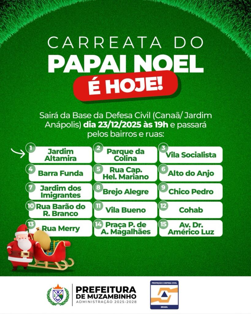 A cidade de Muzambinho entra no clima natalino nesta terça-feira (23) com a tradicional Carreata do Papai Noel, promovida pela Prefeitura Municipal em parceria com a Defesa Civil. O evento acontece a partir das 19h e promete levar alegria, música e espírito de Natal a diversos bairros do município.