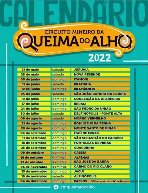 Após dois anos parados, os municípios e as comitivas que fazem parte do Circuito Mineiro da Queima do Alho, já tem data definida para retomar às atividades. A Queima do Alho, além de ser um evento cultural e familiar, também é uma festa solidária.