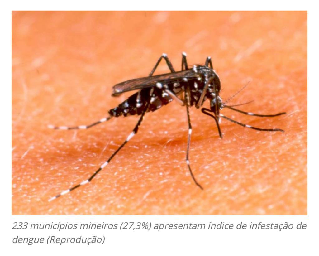 A Secretaria de Estado de Saúde de Minas Gerais (SES-MG) divulgou os resultados do primeiro Levantamento Rápido de Índice para Aedes aegypti (LIRAa) de 2022. O levantamento mostra o nível de infestação do mosquito transmissor da dengue, zika e chikungunya. De acordo com a pesquisa, 233 municípios mineiros (27,3%) apresentam índice de infestação igual ou maior que 4 e, por isso, estão em situação de risco. Destes, cerca de 15 são da região de Juiz de Fora: Bicas, Chiador, Mar de Espanha, Matias Barbosa, Santana do Deserto, Piau, Além Paraíba, Dona Eusébia, Volta Grande, Manhuaçu, Dores do Turvo, Guiricema, Tocantins, Ubá e Visconde do Rio Branco. (Tribuna de Minas – Juiz de Fora)