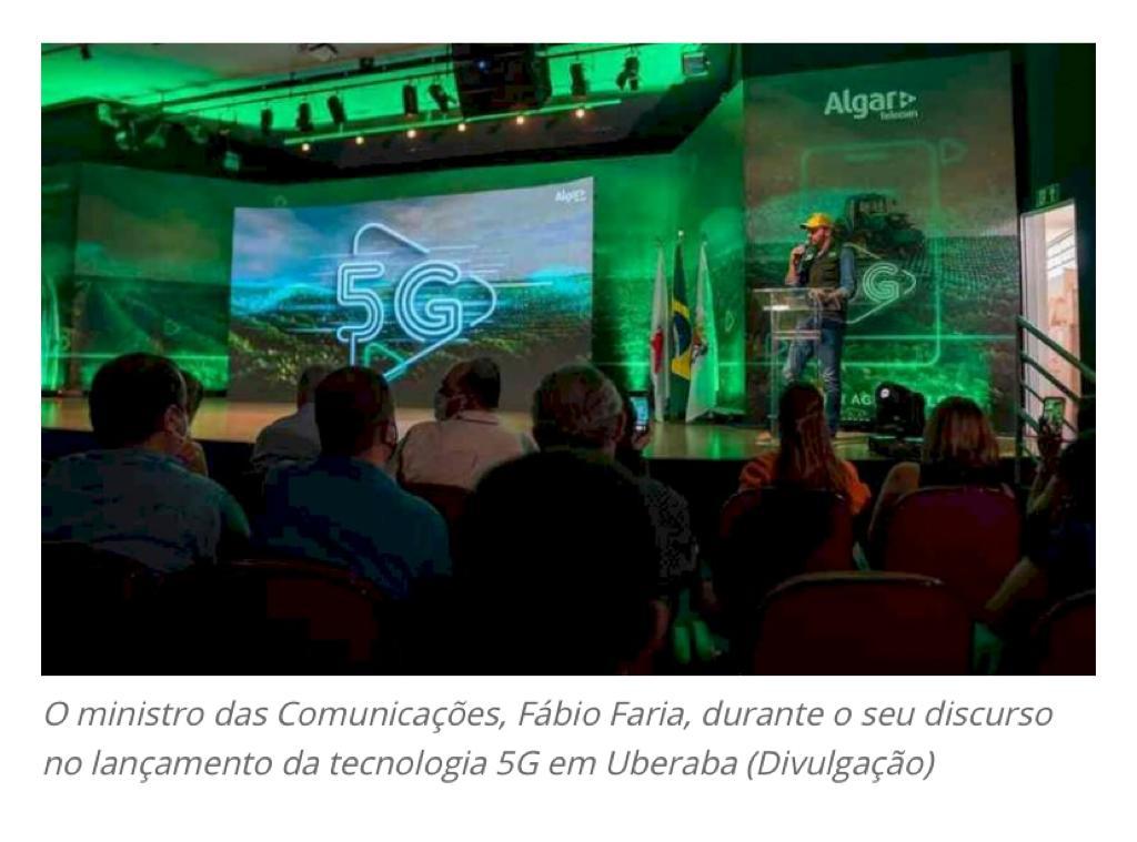 Na tarde de quinta-feira, representantes do governo e autoridades participaram do lançamento da antena de 5G no Instituto Federal do Triângulo Mineiro, em Uberaba (MG). O evento é a primeira experiência com a tecnologia após a realização do leilão do 5G na cidade que pode ter cobertura 5G ampliada ainda este ano. A informação é do ministro das Comunicações, Fábio Faria, que participou nesta quinta-feira (2) do lançamento oficial da nova tecnologia na cidade. Inserida em projeto-piloto do Ministério das Comunicações, Uberaba por enquanto tem apenas uma antena provisória instalada no IFTM para atender projetos de inovação voltados para o agronegócio. A previsão é que antenas comerciais sejam instaladas na cidade até o fim de dezembro. (Jornal da Manhã – Uberaba)
