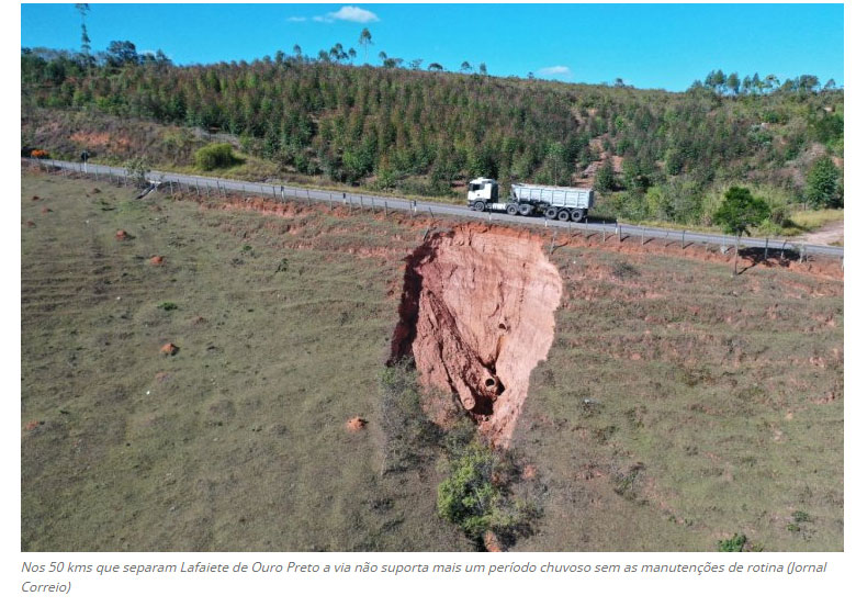 Uma erosão gigantesca que começou após o período chuvoso ameaça engolir a rodovia MG- 129 (Estrada Real), que liga Lafaiete a Ouro Branco. O buraco está localizado no início da subida para a localidade de Carreiras, já no município de OB e possui cerca de 10 metros de diâmetro e outros tantos de profundidade. Ele está a poucos metros da estrada, mas por causa do traçado da via, quem desce ou sobe não consegue ter a dimensão do perigo. A MG-129 é de vital importância para a economia da região, já que faz a ligação para a cidade de Ouro Preto e as comunidades de Lavras Novas, Santa Rita, entre outras. (Jornal Correio – Conselheiro Lafaiete)