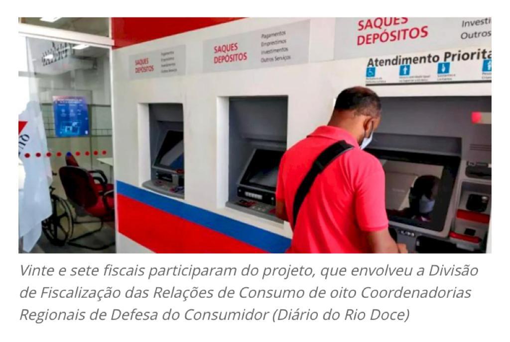 O Procon-MG divulgou nesta semana o balanço das fiscalizações realizadas em agências bancárias no estado. De acordo com o órgão, foram fiscalizadas 338 agências em 105 cidades de Minas Gerias, 296 das quais foram autuadas. Ou seja, em quatro meses, fiscais identificaram com algum tipo irregularidade 88% dos bancos visitados. O problema encontrado com maior frequência foi a ausência de cadeira de rodas ou de cartaz indicativo da disponibilidade dela, com 185 ocorrências. Em seguida, a ausência de placa informativa da disponibilidade do Código de Defesa do Consumidor, com 107 ocorrências; ausência de atendimento prioritário ao idoso (90), ausência de cabines individuais nos caixas (79) e não entrega de senha para atendimento (76). (Diário do Rio Doce – Governador Valadares)