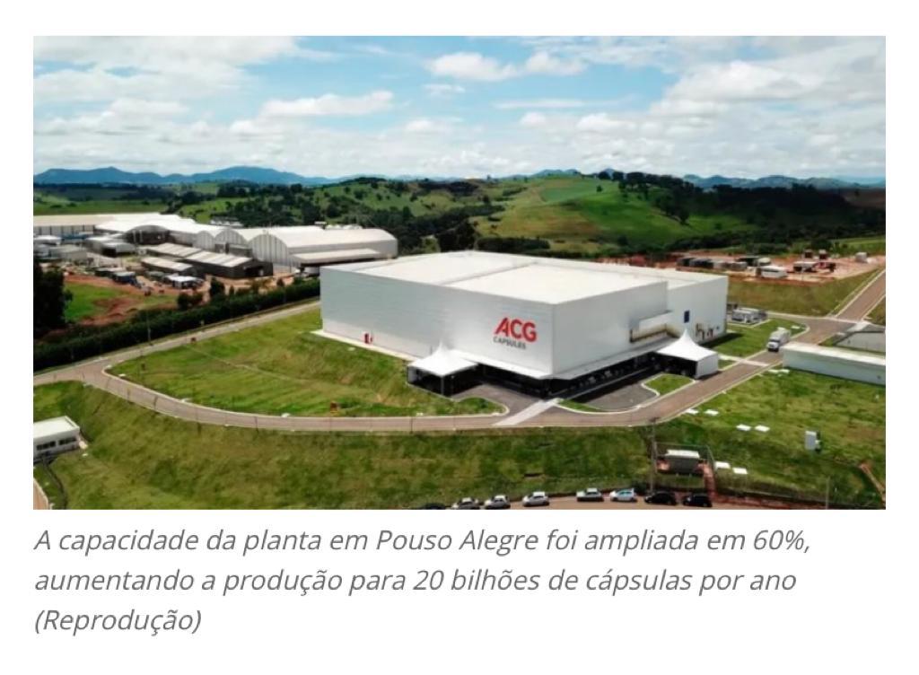 A indústria farmacêutica ACG completou a 1ª fase de um programa de expansão para abertura de quatro novas linhas de produção e geração de 100 novos postos de trabalho diretos e indiretos de sua fábrica em Pouso Alegre (MG), especializada na produção de cápsulas. Conforme a empresa, a capacidade da planta foi ampliada em 60%, aumentando a produção para 20 bilhões de cápsulas por ano. O investimento é de US$ 20 milhões. Segundo o gerente geral de vendas e marketing para o Brasil e América Latina da empresa, Raphael Sideris, a expansão fará com que a fábrica tenha capacidade de atender todo o mercado brasileiro. (Diário Regional – Pouso Alegre)