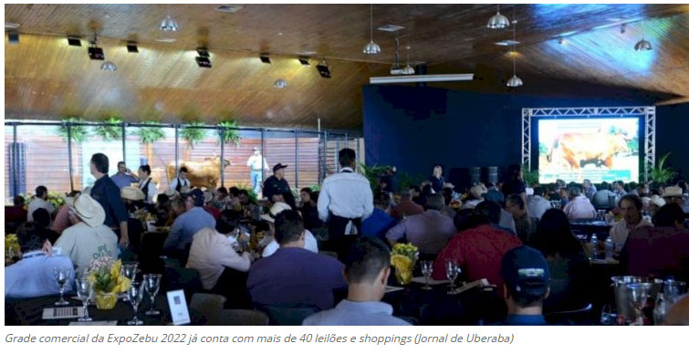 Despontando como uma das temporadas comerciais mais aguardadas da pecuária nacional, a agenda de leilões e shoppings da 87ª ExpoZebu já conta com 43 eventos. Em comparação com a última edição presencial da feira, são sete eventos comerciais a mais em 2022. “A quantidade de leilões e shoppings da nossa ExpoZebu é mais um indicativo de que teremos uma edição histórica. O setor está esperando por essa retomada presencial da maior feira da pecuária zebuína no mundo, e isso, sem dúvida, refletirá em bons negócios”, comemora Rivaldo Machado Borges Júnior, presidente da ABCZ. Nesta edição a temporada começa no dia 28 de abril e segue até 8 de maio, ú ltimo dia da feira. (Jornal de Uberaba)