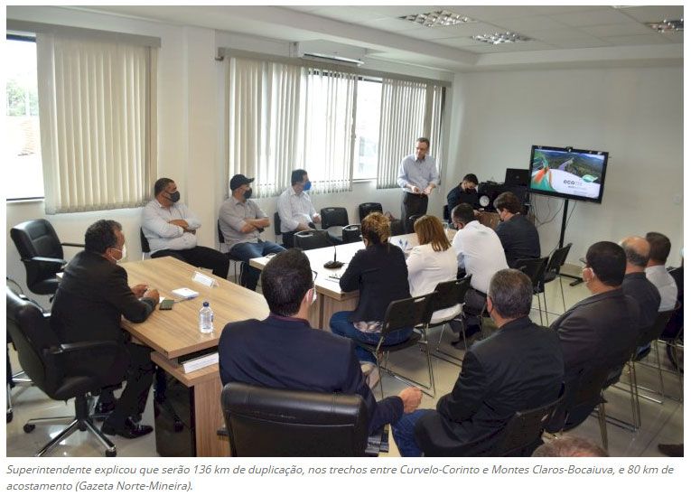 Os vereadores de Montes Claros se reuniram, nesta semana, com o superintendente da EcoRodovias/Eco135, Marcelo Bevilaqua, para conhecer o projeto de duplicação da BR-135 e de construção do Anel Rodoviário Norte. O presidente da Câmara, vereador Cláudio Rodrigues, explica que a reunião foi motivada pelas muitas demandas apresentadas por moradores das comunidades do entorno da rodovia, que estão com dificuldades para acessar as comunidades rurais do município e, também para transpor a via. (Gazeta Norte Mineira – Montes Claros)