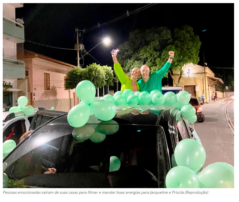 As amigas Priscila Barroca e Jacqueline Zamboni fizeram uma comemoração inusitada na semana passada em Além Paraíba: com uma passeata pelas ruas da cidade, elas participaram de uma manifestação de conscientização e mobilização contra o câncer de útero e de ovário e, assim, celebraram a última etapa de quimioterapia a qual foram submetidas na luta contra o câncer. A carreata percorreu as principais ruas da cidade e um carro de som, com uma gravação de Edney Jones, vinha à frente explicando sobre o câncer e seus tratamentos. Dezenas de carros fizeram parte dessa mobilização. (Agora Jornais – Além Paraíba)