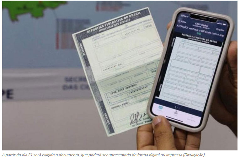 A partir do dia 21 de novembro será obrigatório que proprietários de veículos de Minhas Gerais tenham o Certificado de Registro de Licenciamento de Veículo (CRLV) 2022. A determinação foi publicada no Diário Oficial do Governo de Minas no sábado através do Departamento de Trânsito de Minas Gerais. A Portaria indica que o veículo somente será considerado licenciado quando estiver sem débitos relativos a tributos, encargos e multas de trânsito e ambientais, vinculadas ao veículo. Assim, o documento poderá ser apresentado de forma digital ou impressa. Também é possível consultar o site para verificar a situação do licenciamento do veículo e tirar outras dúvidas.  (Tribuna de Minas – Juiz de Fora)