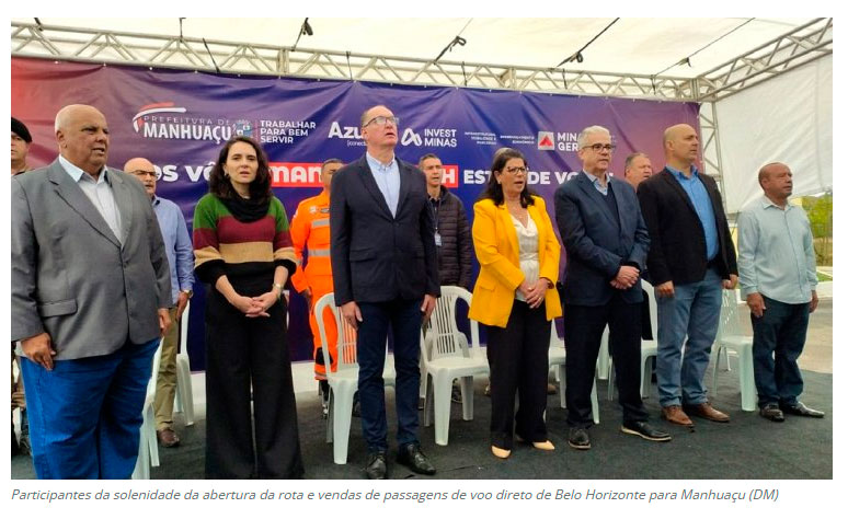 A aviação regional segue em expansão em Minas. A Azul anunciou, na quarta-feira, 26, em concorrida solenidade, o início das vendas de passagens aéreas ligando o Aeroporto de Confins, de Belo Horizonte, ao Aeroporto Regional de Santo Amaro de Minas, em Manhuaçu. A rota atende à reivindicação histórica da população local e foi viabilizada em parceria entre Governo de Minas, Azul e a BH Airport. Para a prefeita de Manhuaçu, Imaculada Dornelas, “o município decola em mais esse projeto de expansão em parceria com a Azul, garantindo o fortalecimento da aviação regional em Minas Gerais”, afirmou. Os voos terão início em 16/10, com quatro dias por semana. (Diário de Manhuaçu)