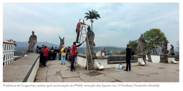 A preservação do Patrimônio Histórico de Congonhas é uma das responsabilidades centrais da administração municipal. Após a obtenção da autorização do Instituto do Patrimônio Histórico e Artístico Nacional (IPHAN) para a realização do tratamento e remoção dos líquens presentes nas esculturas dos 12 Profetas, foi celebrado em maio de 2023 um contrato com o Grupo Oficina de Restauro. O projeto, agora em andamento, visa a remoção das colônias de micro-organismos que afetavam as esculturas dos 12 Profetas de pedra-sabão, localizadas no adro da Basílica do Senhor Bom Jesus de Matosinhos. (Correio Online – Conselheiro Lafaiete) https://www.jornalcorreiodacidade.com.br/noticias/31756-congonhas-processo-de-conservacao-dos-12-profetas-avanca-para-preservar-o-patrimonio-historico