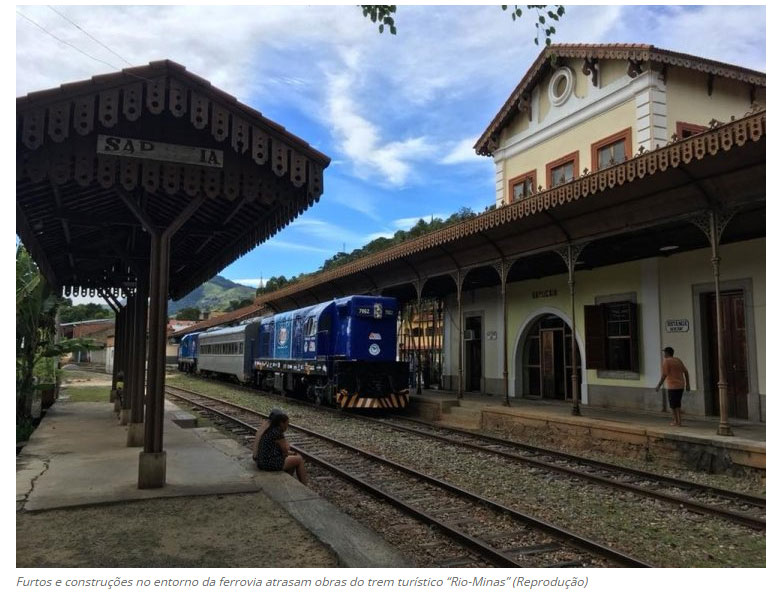 O andamento das obras para o início das atividades do trem turístico “Rio-Minas” está prejudicado por causa de furtos de dormentes, trilhos e construções irregulares no entorno das ferrovias. Como medida para solucionar a questão, o Ministério Público Federal (MPF) fez uma série de recomendações à Agência Nacional de Transportes Terrestres (ANTT). Os trabalhos começaram em junho e estão em andamento no trecho que liga as cidades de Três Rios e Sapucaia. A previsão para conclusão é dia 19 de janeiro de 2023, segundo a Organização da Sociedade Civil de Interesse Público (Oscip) Amigos do Trem. (Além Parahyba – Além Paraíba)