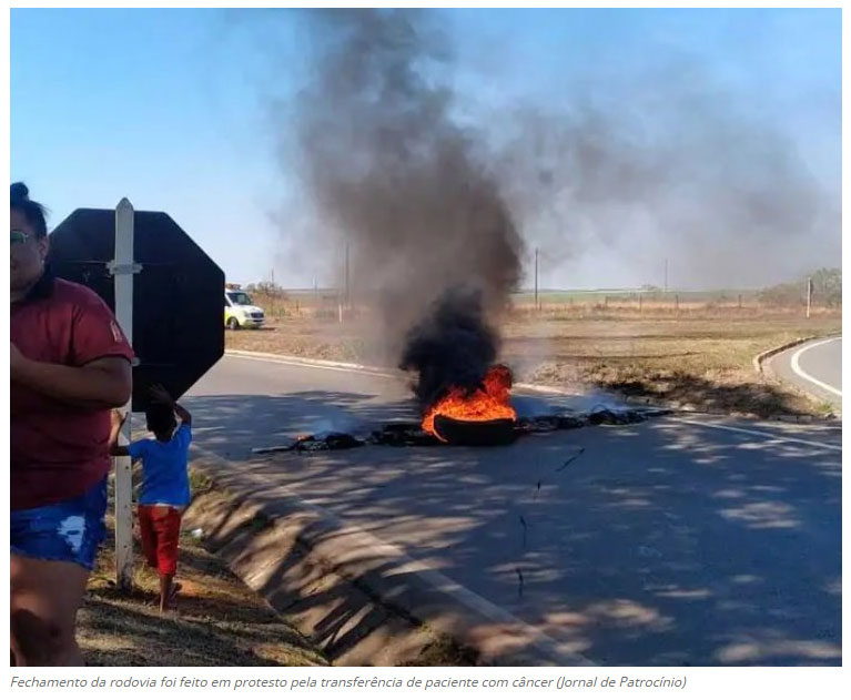 Revoltados com demora para transferir um paciente com câncer, moradores do distrito de Luizlândia do Oeste, no município de João Pinheiro, fecharam o entroncamento entre as BRs 365 e 040. Eles alegam que Levi Rodrigues de Freitas, está internado há quase 30 dias aguardando vaga em um hospital de referência. Levi trabalha como gari da prefeitura no distrito de Luizlândia do Oeste (JK). Ele foi diagnosticado com câncer e está internado no Hospital Municipal Antônio Carneiro Valadares aguardando uma transferência para um hospital de referência para iniciar o tratamento oncológico. (Jornal de Patrocínio – Patrocínio)