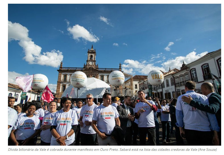 Foi lançado em Ouro Preto um manifesto organizado pela Associação dos Municípios Mineradores de Minas Gerais e do Brasil (AMIG), para cobrar uma dívida de mais de R$ 2 bilhões em royalties da Vale/SA, com 28 municípios mineradores de Minas Gerais, Pará, Amapá, Goiás, Mato Grosso do Sul e Sergipe. O evento reuniu, aproximadamente, 1000 pessoas na Praça Tiradentes, que endossaram a campanha que alerta sobre o impacto negativo causado aos cofres públicos em função do não recolhimento da Compensação Financeira pela Exploração Mineral. (Folha de Sabará)