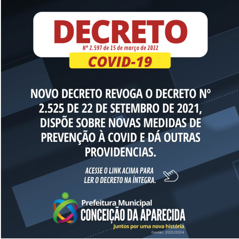 Foi divulgado nas redes sociais da Prefeitura de Conceição da Aparecida, o novo decreto de prevenção ao coronavírus.