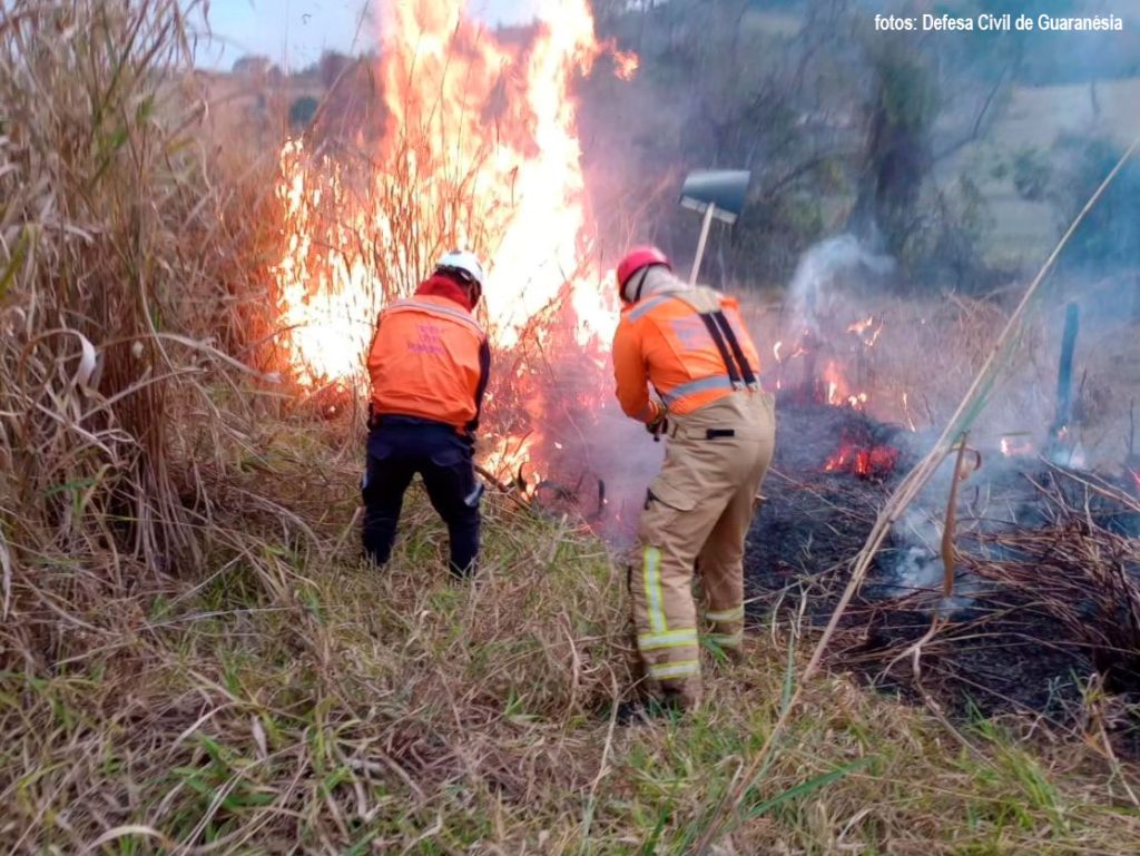 CORPO DE BOMBEIROS, DEFESA CIVIL E MORADORES, COMBATEM INCÊNDIO EM VEGETAÇÃO NA ZONA RURAL DE GUARANÉSIA