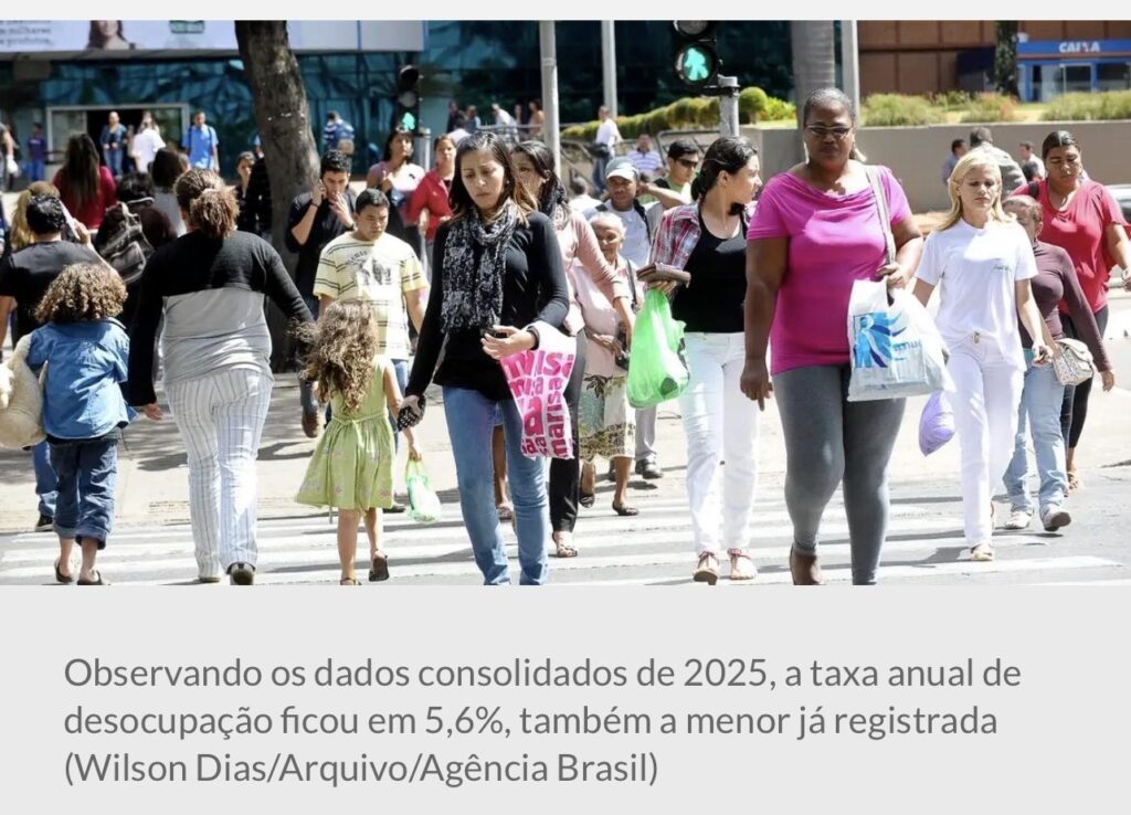 Observando os dados consolidados de 2025, a taxa anual de desocupação ficou em 5,6%, também a menor já registrada. O número de ocupados chegou a 103 milhões.