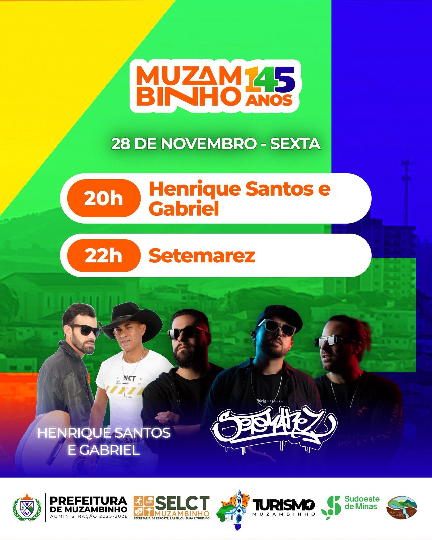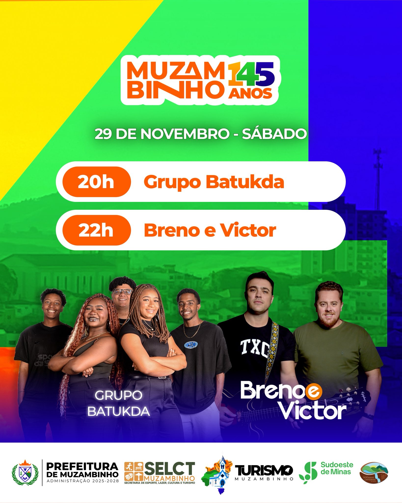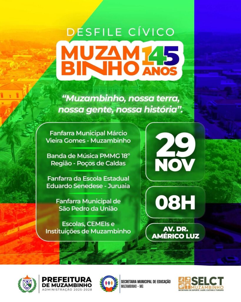 Muzambinho está em festa, e para celebrar seus 145 anos uma programação especial que promete movimentar o fim de semana e atrair moradores e visitantes para a Praça Pedro de Alcântara. As atividades culturais, musicais e cívicas, promovidas pela Secretaria Municipal de Esporte, Lazer, Cultura e Turismo, começam nesta sexta-feira, 28 de novembro, e seguem até domingo, 30, reunindo artistas locais, escolas do município e nomes consagrados do cenário regional.