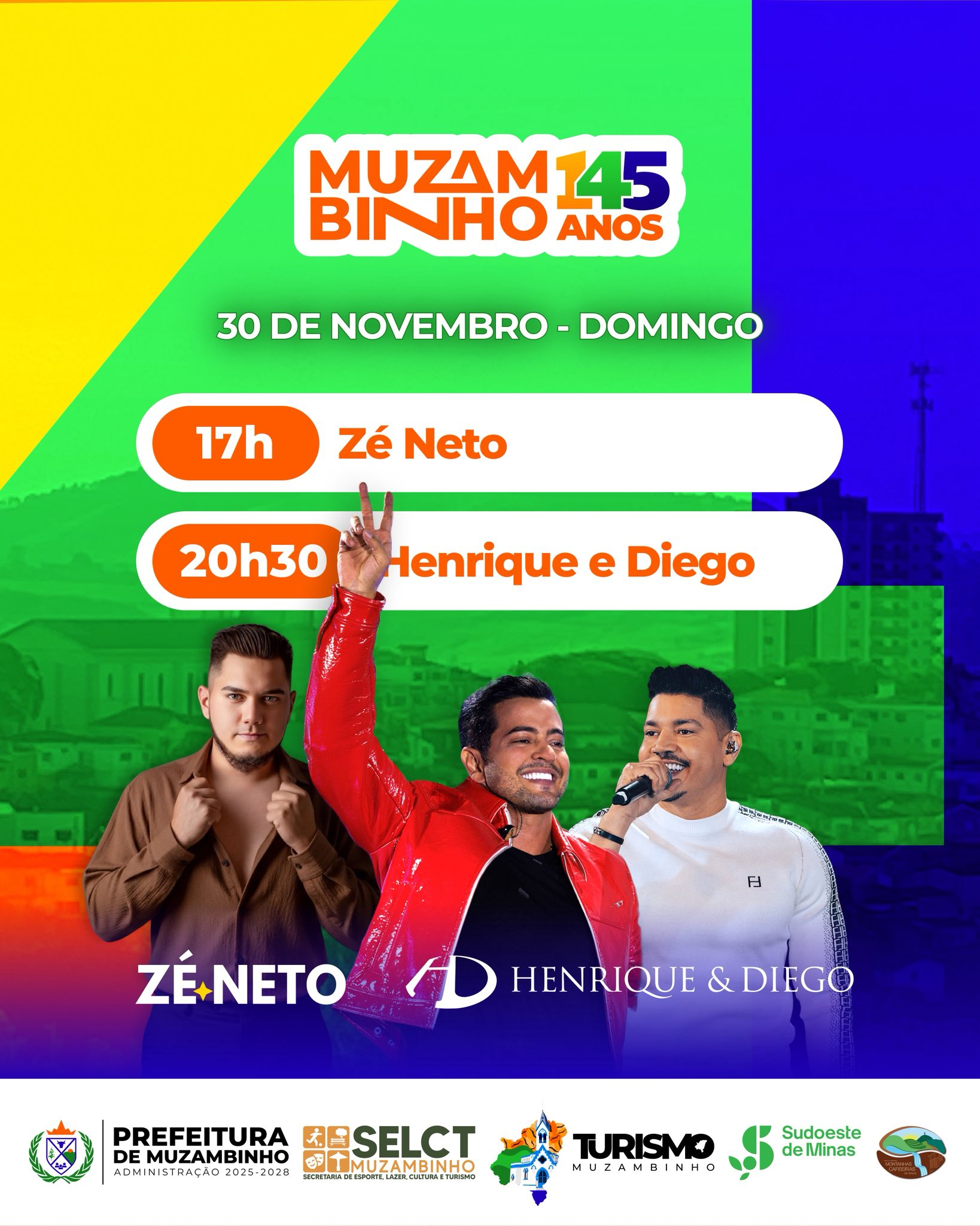 Já no domingo, dia 30, as comemorações ganham tom ainda mais especial. A partir das 17h, o cantor Zé Neto será a atração principal da tarde, trazendo ao público seu carisma e músicas conhecidas nacionalmente. Para fechar o aniversário de 145 anos, a dupla Henrique e Diego se apresenta às 20h30, garantindo um encerramento animado e marcado por hits que conquistaram o Brasil.