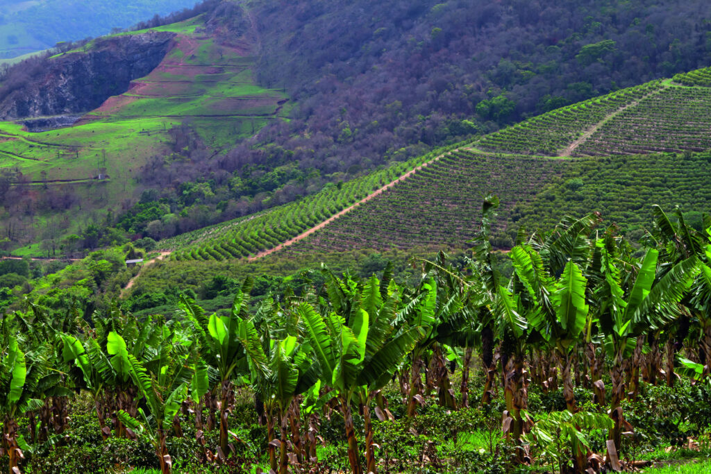 Com o clima de altitude e solos férteis, a região é ideal para o cultivo das duas culturas. Muitos produtores de café passaram a apostar na banana como forma de sombreamento natural para as mudas de café, especialmente nas fases mais críticas de crescimento. As bananeiras ajudam a reduzir o impacto do sol forte e dos ventos, criando um microclima mais estável e úmido – condição que favorece o desenvolvimento do cafeeiro.