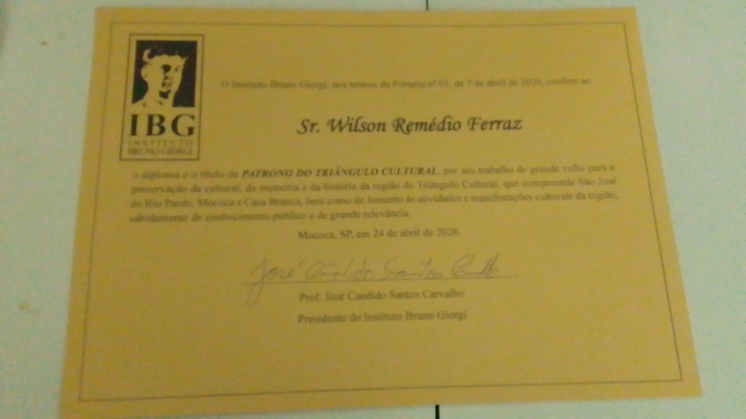 Naquela oportunidade foram outorgados os títulos e diplomas de “Guardião da História e da Cultura Mocoquense” ao Prof. Dr. Antonino da Silva; de Patronesse do “Triângulo Cultural, Mococa, São José do Rio Pardo e Casa Branca” à Professora Dra. Carmen Cecília Trovatto Maschietto; e de patronos do triângulo cultural aos pesquisadores: Luís Renato Thadeu Lima e a Wilson Ferraz, colaborador deste jornal.