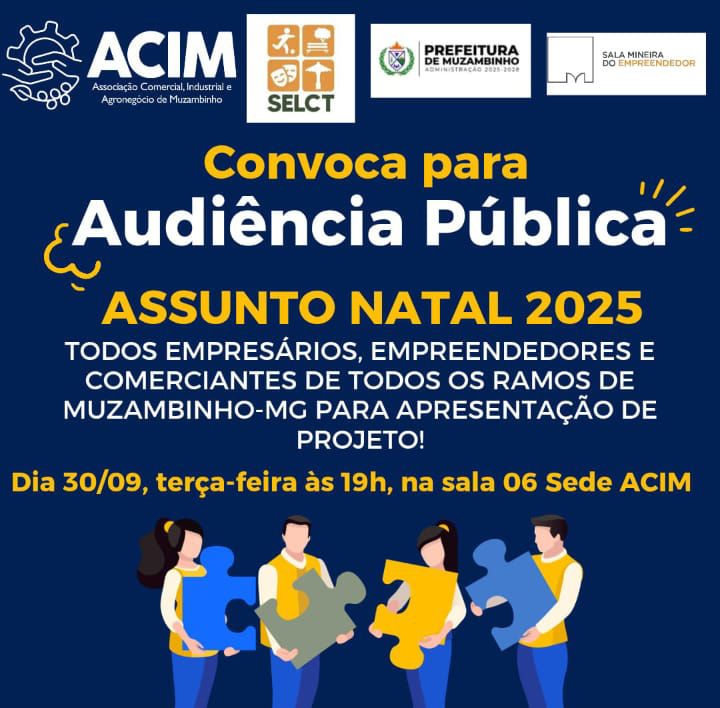 A Associação Comercial e Industrial de Muzambinho (ACIM), em parceria com a Prefeitura Municipal, a Secretaria de Esporte, Lazer, Cultura e Turismo (SELCT) e a Sala Mineira do Empreendedor, está convocando todos os empresários, empreendedores e comerciantes da cidade para participarem de uma importante audiência pública sobre o Natal 2025.