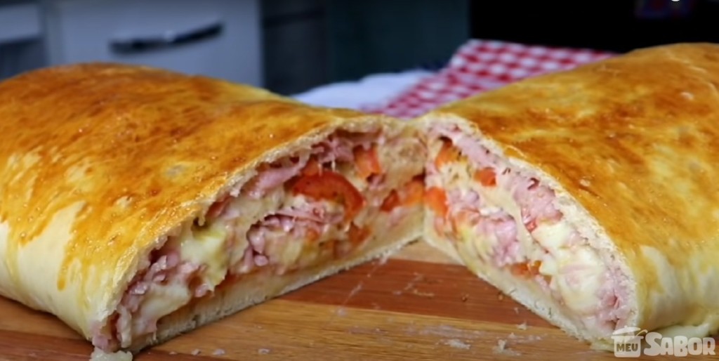 - Divida a massa em 6 partes (seis pães grandes) e abra, individualmente com um rolo; aplique o recheio sobre a massa aberta (na espessura de uma massa fina de pizza) e enrole (sem apertar) feito um rocambole.