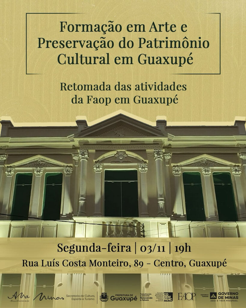 A Fundação de Arte de Ouro Preto (Faop) inicia, neste dia 3 de novembro, uma série de atividades no município de Guaxupé, no Sul de Minas. A iniciativa integra o Programa de Formação em Arte e Preservação do Patrimônio Cultural, que será desenvolvido até setembro de 2026, com cursos de curta duração voltados a jovens, adultos, professores, artesãos e agentes culturais.