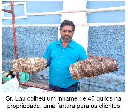 CRESCIMENTO – A feira cresceu, ampliou os produtos oferecidos e se firmou com um ponto de encontro e valorização dos produtos do município. Para Sr. José Lau, produtor rural do bairro Santa Maria, “minha mãe prepara as quitandas na sexta-feira e eu trago para vender aqui na feira há mais de 40 anos. Temos também o mel que produzimos. Cada época do ano, uma produção diferente, agora temos o inhame. Esta semana colhemos um com mais de 40 quilos e para facilitar a venda dividimos em partes”, contou orgulhoso o produtor rural.