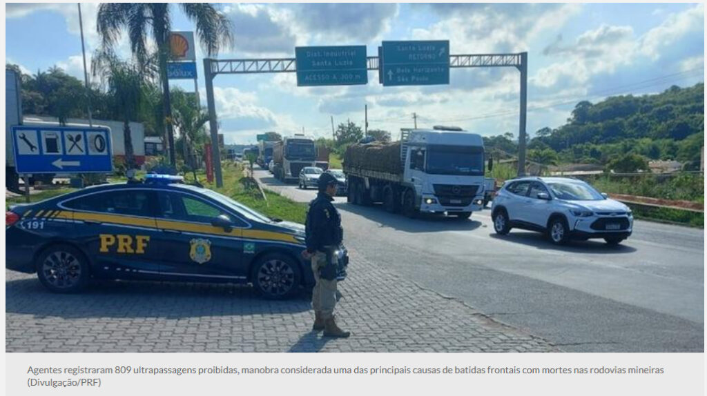 Conforme a PRF, foram identificadas diversas infrações de trânsito durante o feriado. Ao todo, 7.394 veículos foram flagrados transitando acima do limite de velocidade permitido. Além disso, os agentes registraram 809 ultrapassagens proibidas, manobra considerada uma das principais causas de batidas frontais com mortes nas rodovias mineiras.