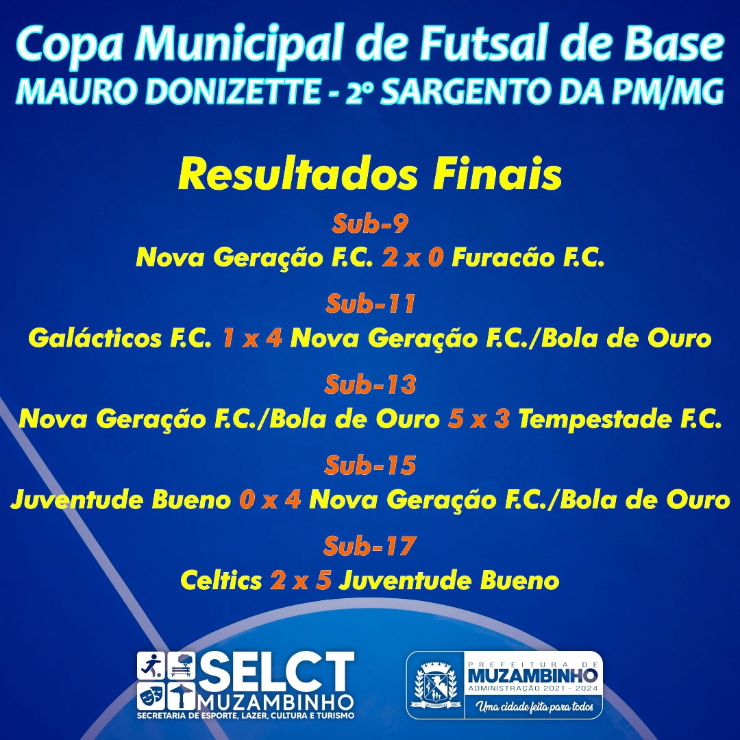 A prefeitura municipal de Muzambinho promoveu através da Secretaria de Esporte, Lazer, Cultura e Turismo a Copa Municipal de Futsal de Base 2023 homenageando o Sargento PM Mauro Donizette, que durante muitos anos promoveu os jogos de futsal envolvendo bairros do município.