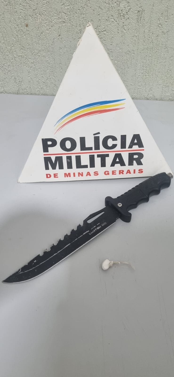 Na abordagem, os policiais localizaram uma faca na cintura do suspeito e um papelote contendo substância semelhante à cocaína.