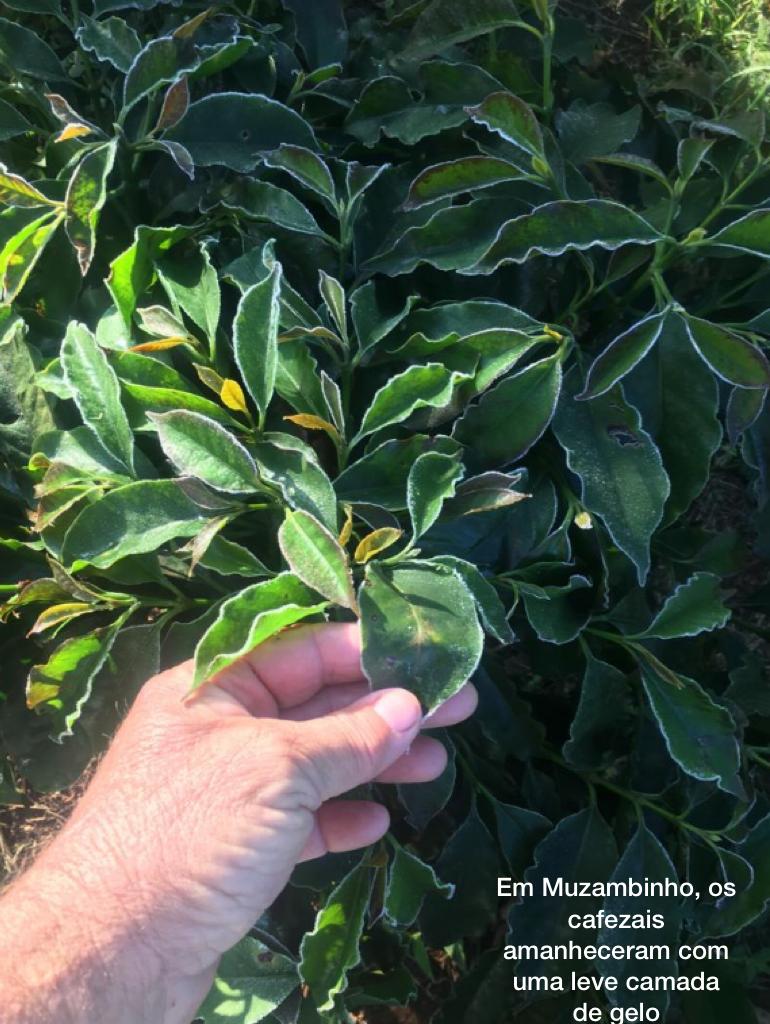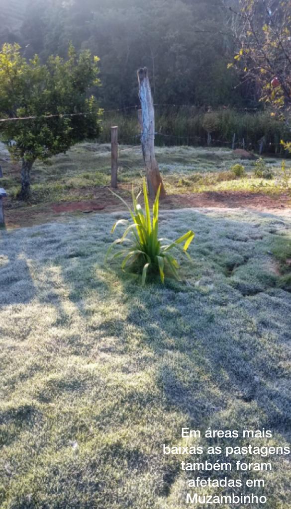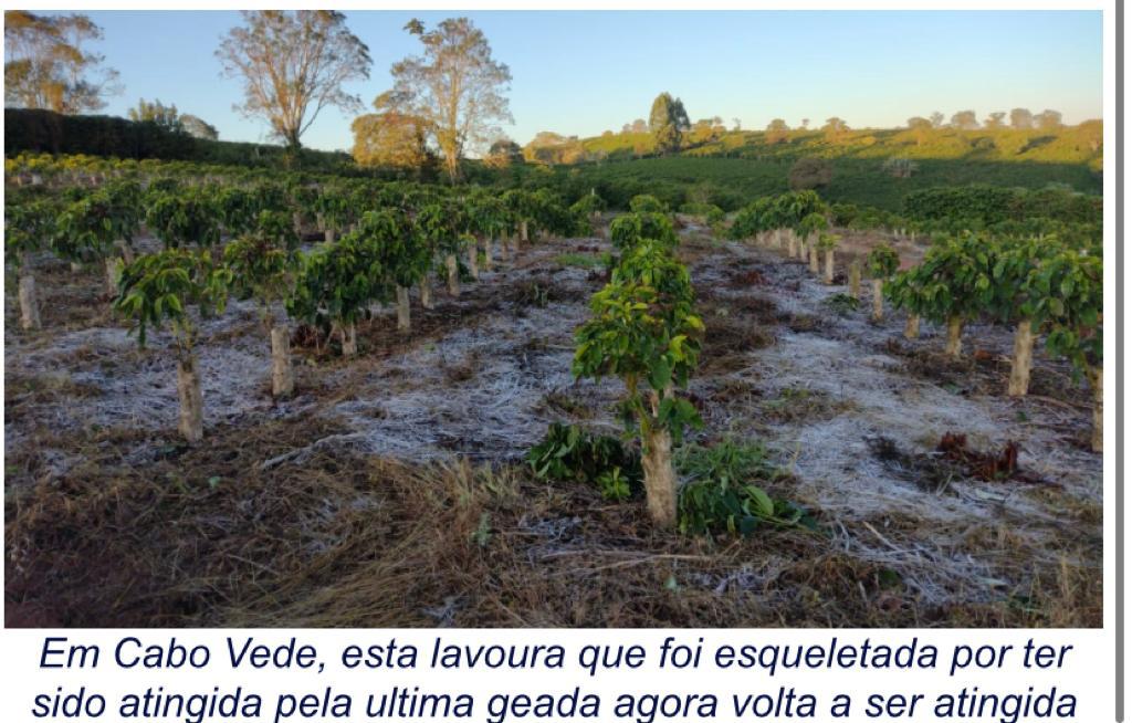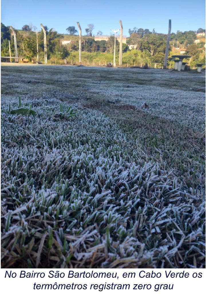 Foram registradas geadas em São Pedro da União, Muzambinho, Cabo Verde e Nova Resende. Para os secretários da agricultura de Cabo Verde “em São Bartolomeu os termômetros as 6 horas da manhã apontavam para 1 grau, recebemos imagens dos produtores que mostram que muitas pastagens foram atingidas de forma moderada. Sabemos que os institutos meteorológicos nacionais apontam para mais alguns dias de frio intenso e novas possibilidades de geada, “disse,