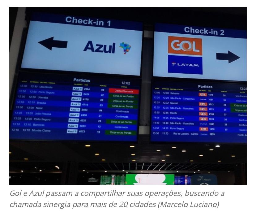 Uma parceria no mínimo inusitada começou esta semana no setor aéreo brasileiro. Eternas concorrentes, Azul e Gol – que segundo especulações do mercado estaria estudando uma possível fusão – iniciaram a venda de passagens de forma compartilhada. Na prática, desta a última quinta-feira, quem quiser viajar para os destinos servidos pelas duas companhias, fazendo conexões que antes eram impensáveis, pode adquirir seu bilhete no site da “concorrente”, sendo que em algumas situações, encontrar até mesmo um preço mais barato. Neste primeiro momento foram selecionados 20 destinos, entre eles o voo Ipatinga-Belo Horizonte, operado pela Azul. (Portal Conex 10)