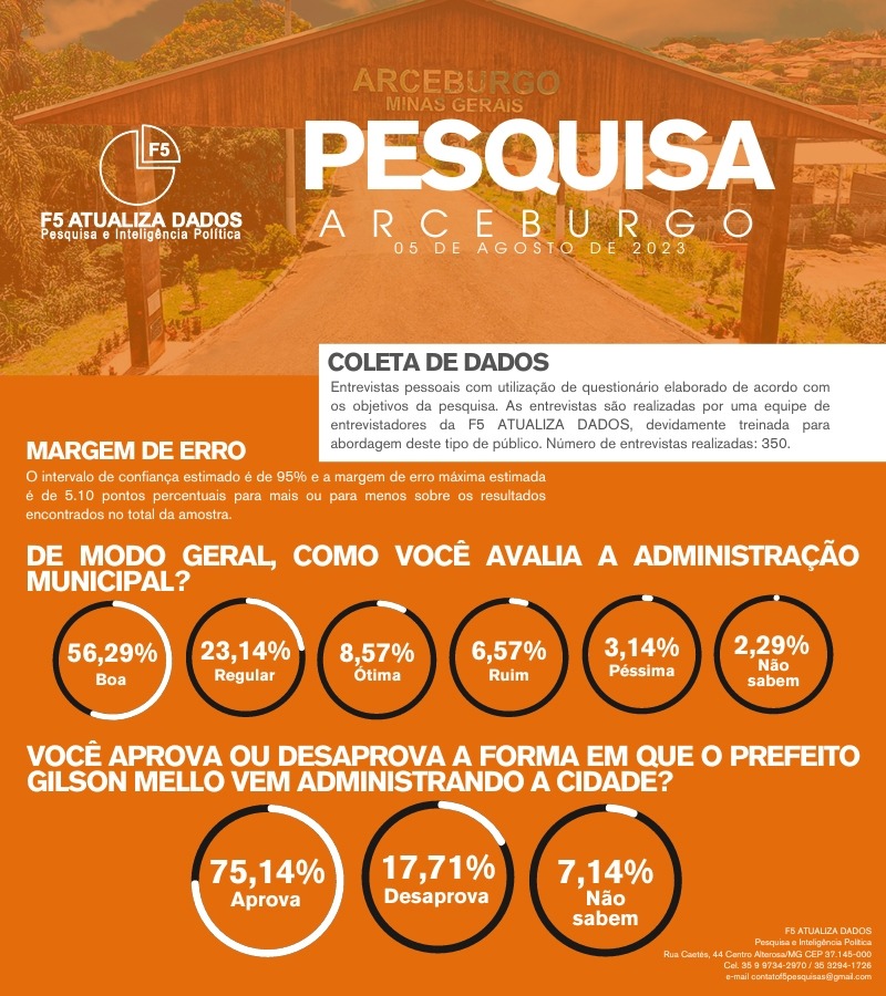 Pesquisa realizada pelo Instituto F5 Atualiza Dados confirma que a maior parte da população do município de Arceburgo aprova a Administração 2021-2024, comandada por Gilson Mello e Margareth Anacleto (foto).