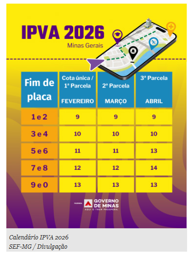 Já está disponível no site da Secretaria de Estado de Fazenda de Minas Gerais (SEF-MG) a consulta, pelo Renavam, dos valores do Imposto sobre a Propriedade de Veículos Automotores (IPVA) para 2026.  A consulta também pode ser feita pelo telefone 155 do LIGMINAS e no aplicativo MG App, do Governo de Minas.